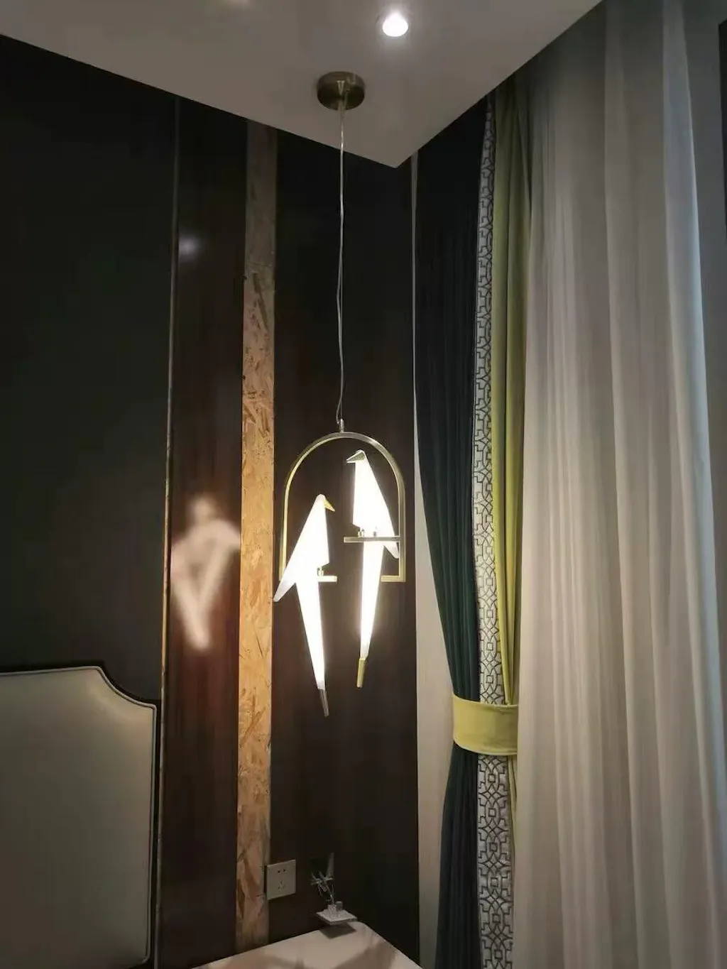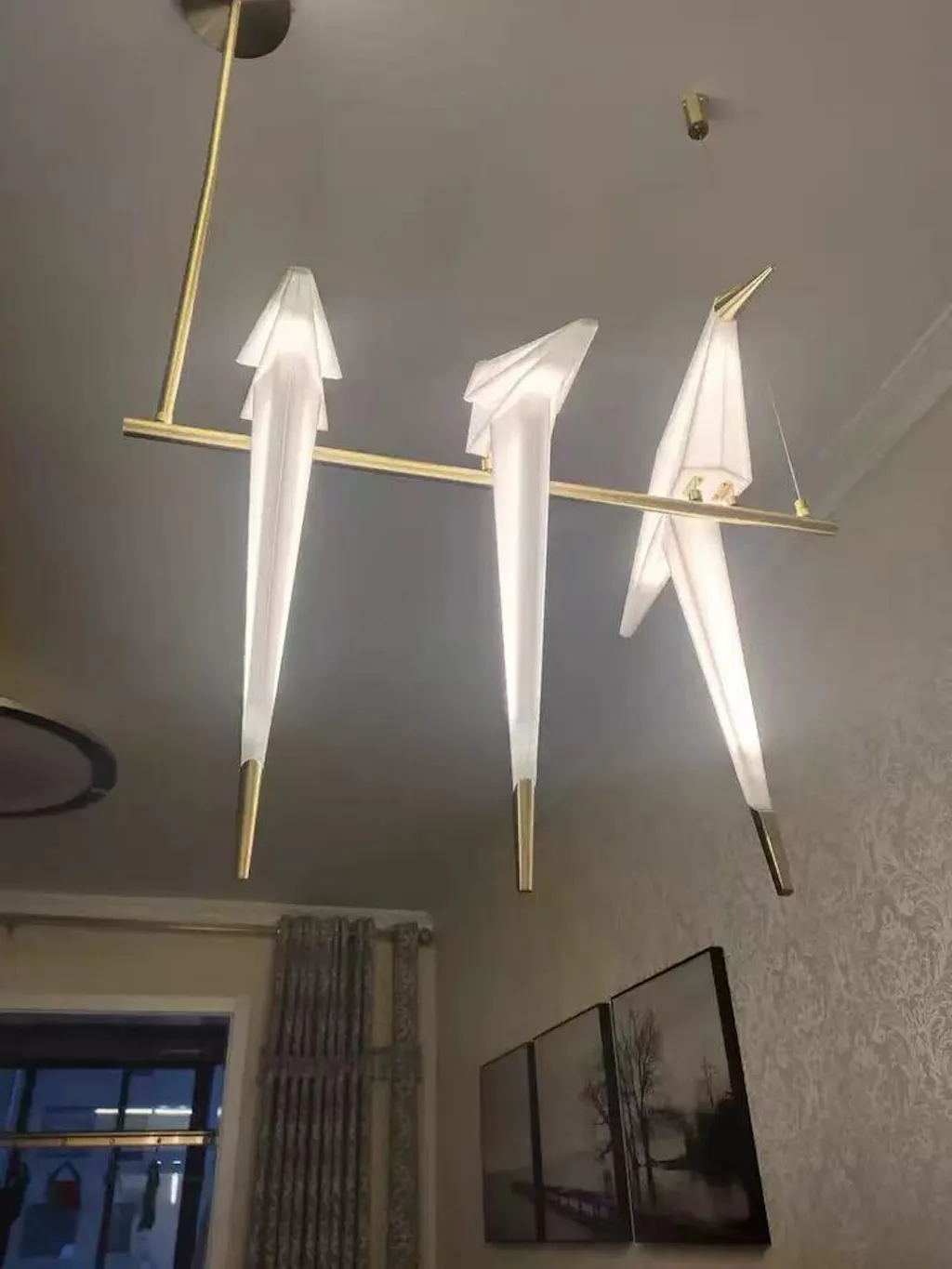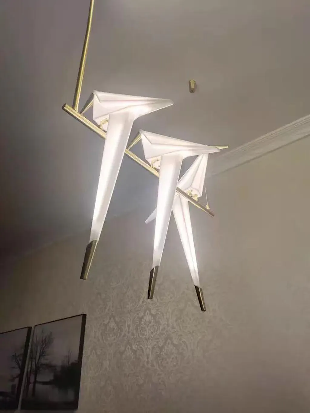Esta pieza combina ingeniosamente la cultura oriental de las grullas de papel con un diseño de iluminación moderno. La iluminación puede tener la forma de un nido de pájaro o alinearse con grullas de papel agrupadas entre ellas, creando una atmósfera pacífica y serena. La luz cae a través de las alas de la grulla de papel, creando suaves y delicados cambios de luz y sombra, como si estuviera contando una antigua historia de mitología oriental.