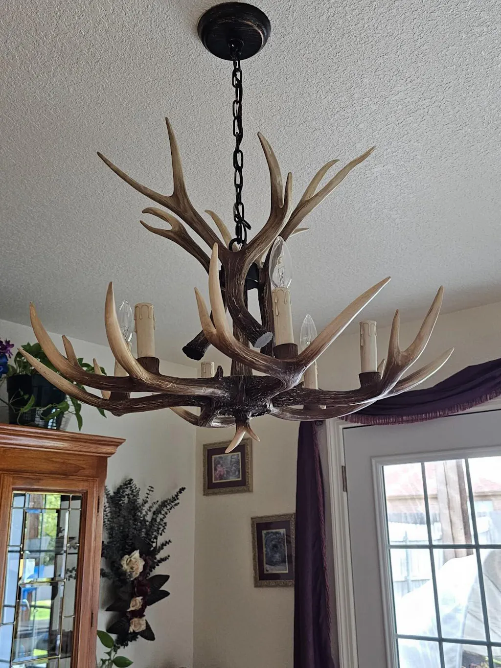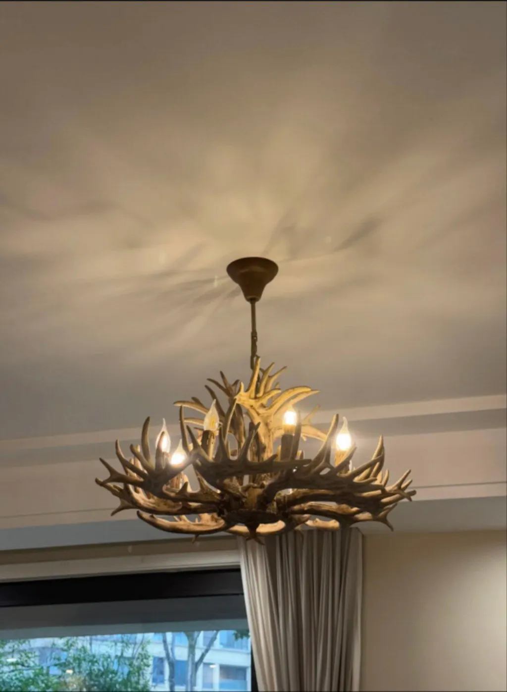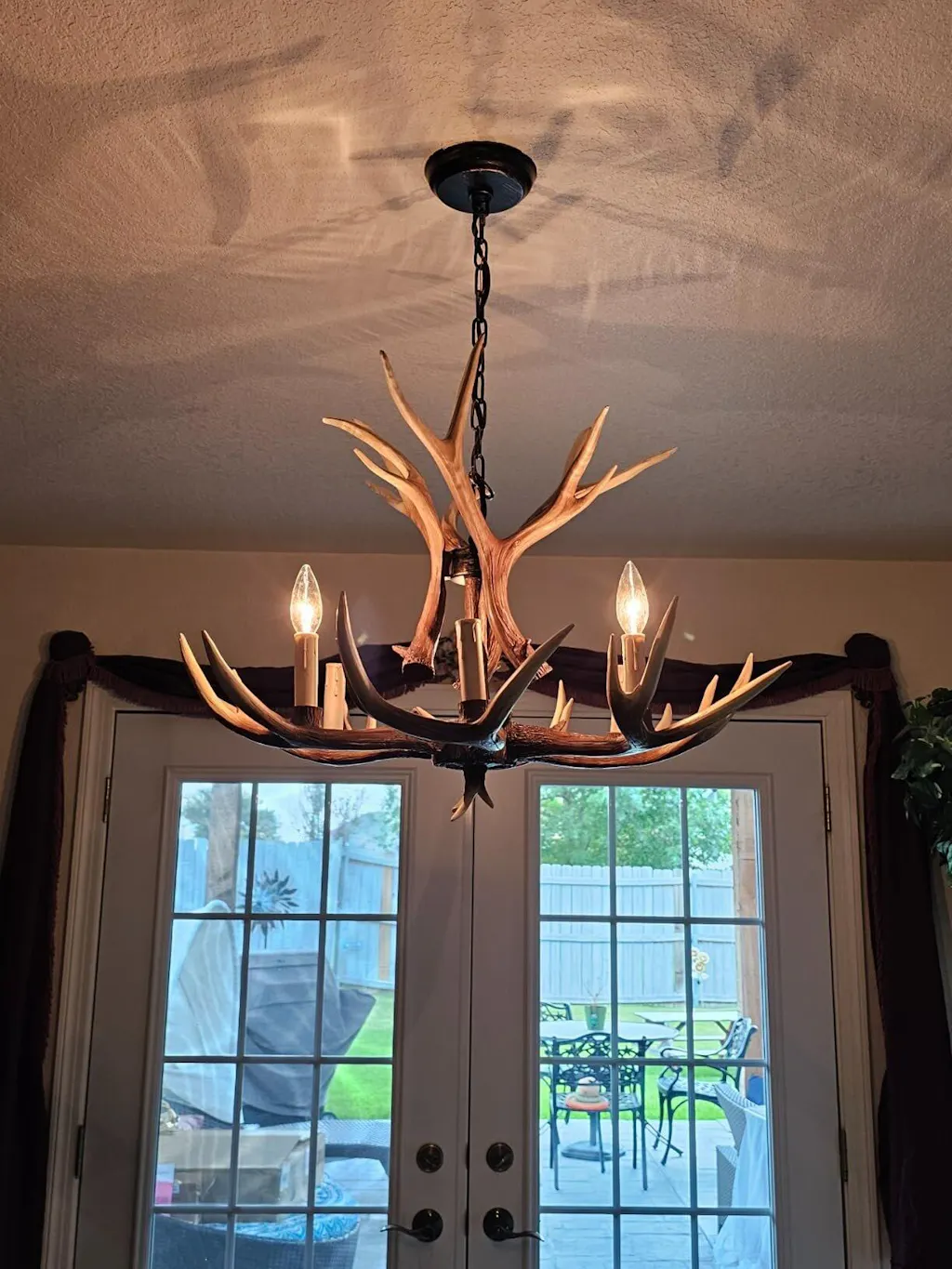 La lámpara de araña rústica con astas muestra la belleza natural de las astas. El cálido resplandor de varias lámparas ilumina un espacio, creando una atmósfera acogedora y añadiendo carácter a cualquier decoración del hogar.