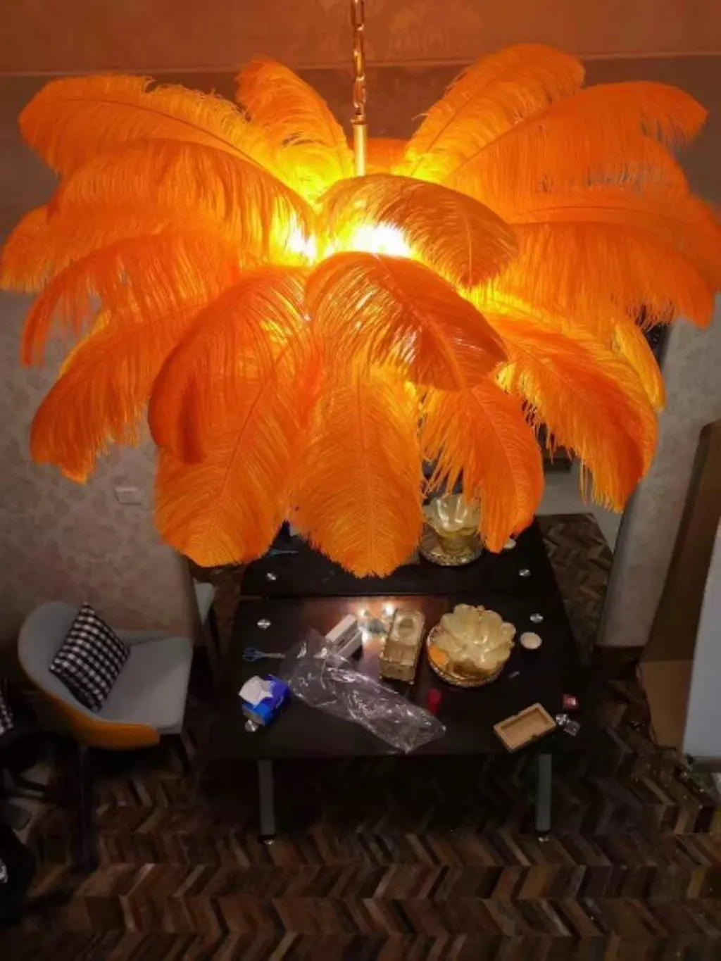 Esta lámpara no solo tiene un impacto visual único, sino que también refleja un nivel muy alto en términos de materiales y artesanía. Las plumas se seleccionan y procesan cuidadosamente para garantizar una textura delicada y suave.