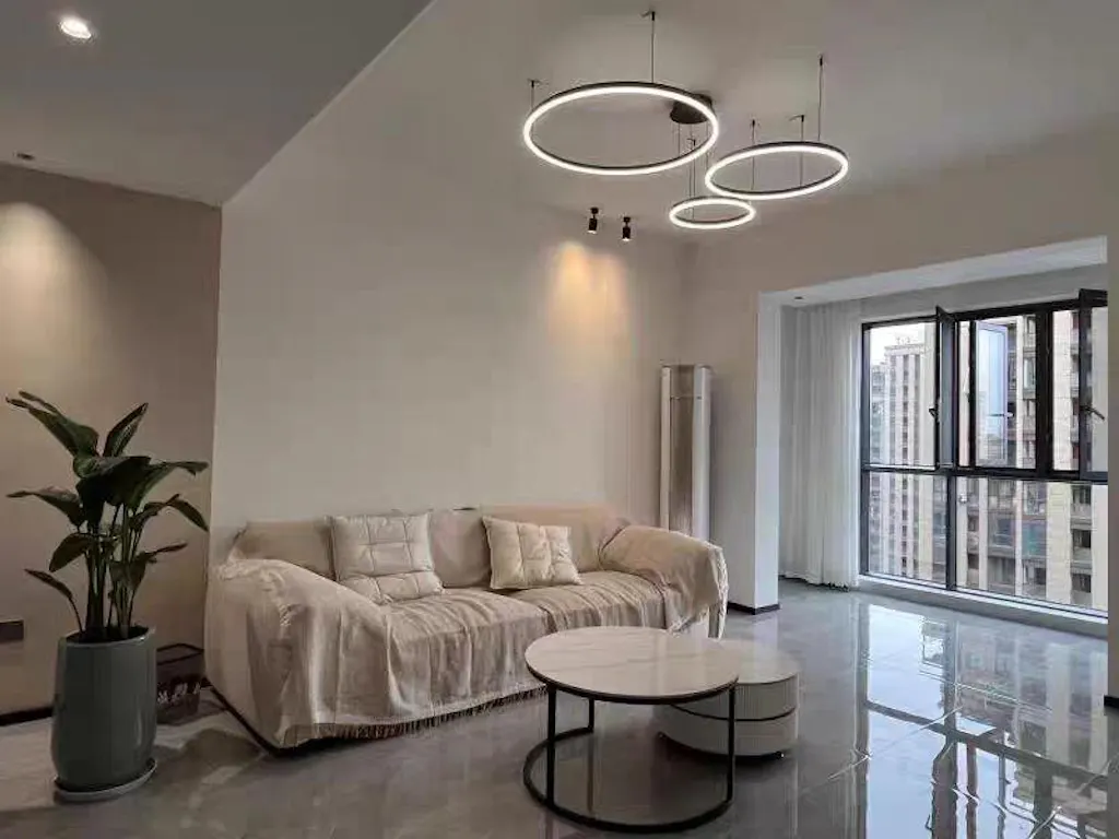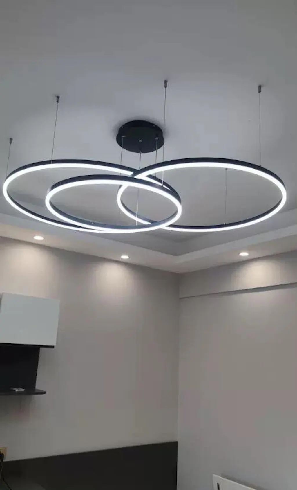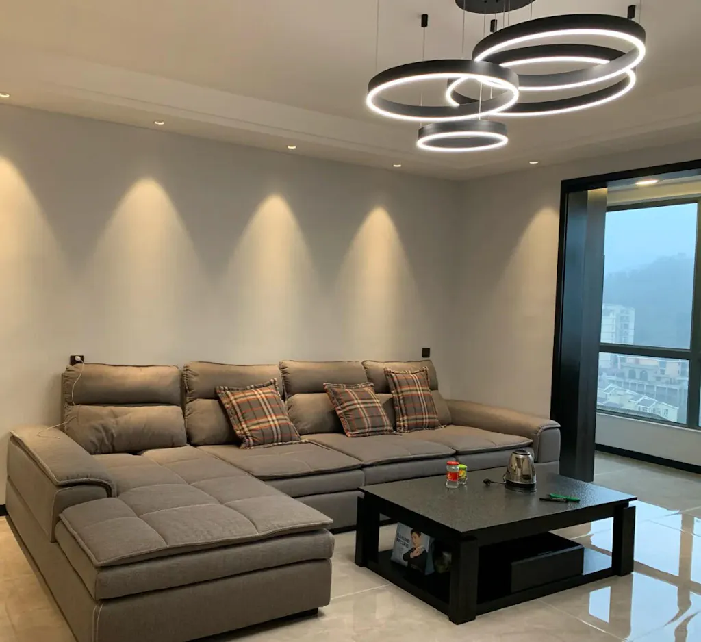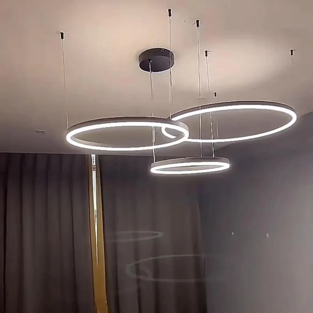 El diseño circular crea un efecto visual redondo y atmosférico, llenando el espacio de modernidad. Varias fuentes de luz LED están dispuestas en el anillo y la luz es suave y uniforme, creando una atmósfera de iluminación cálida y confortable.