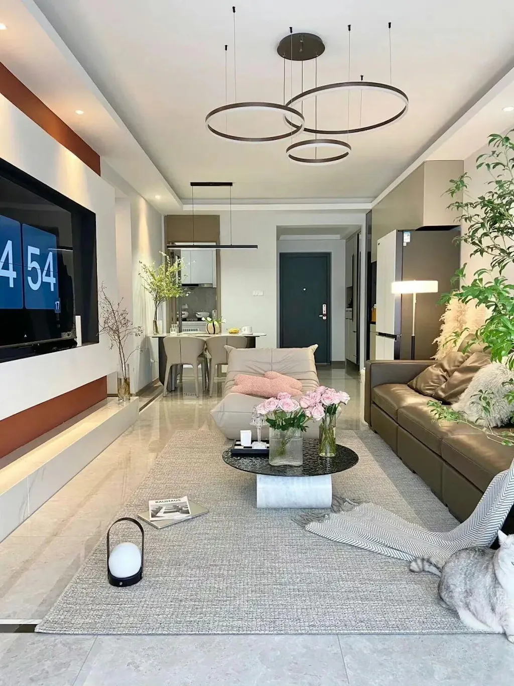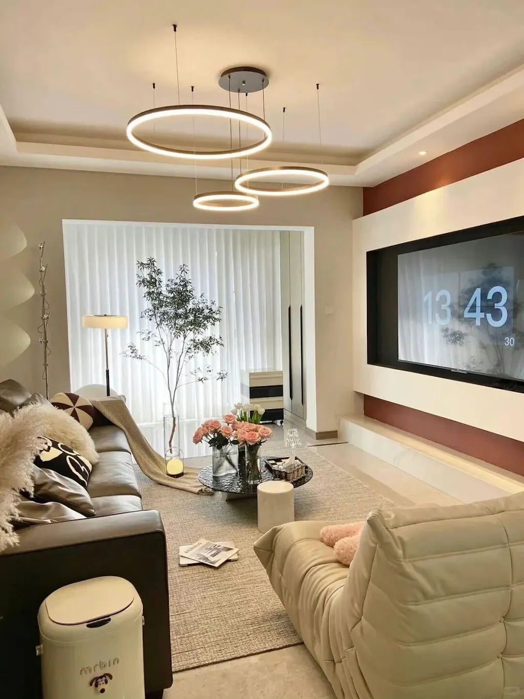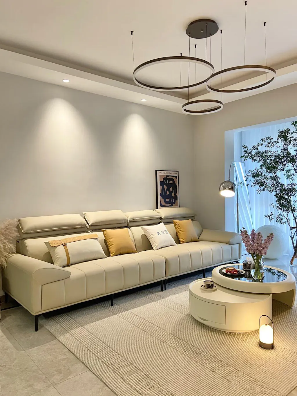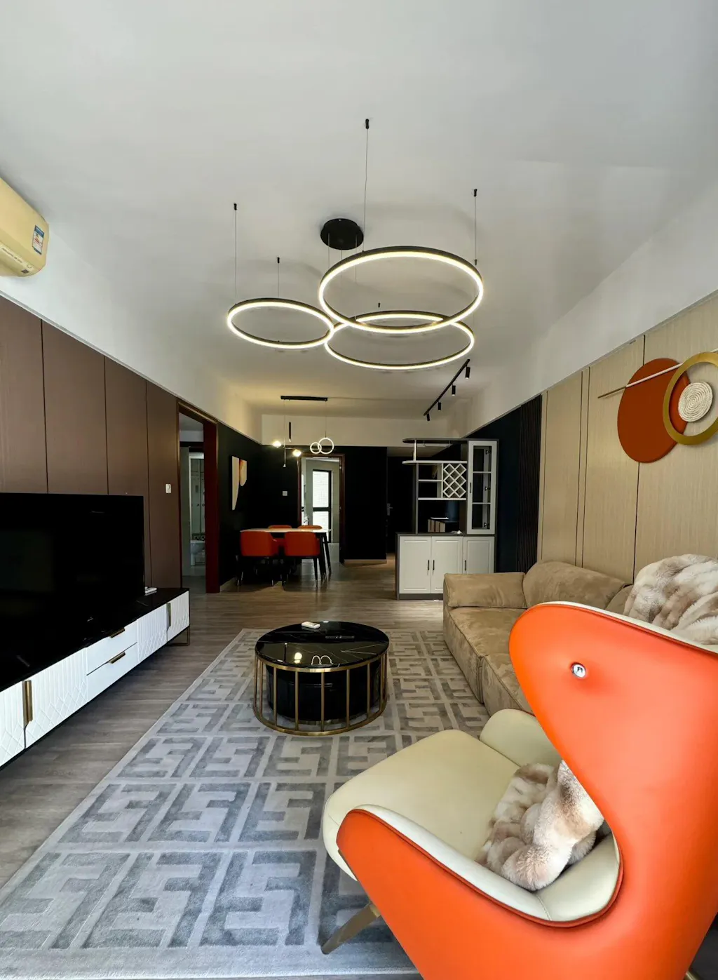 El diseño circular crea un efecto visual redondo y atmosférico, llenando el espacio de modernidad. Varias fuentes de luz LED están dispuestas en el anillo y la luz es suave y uniforme, creando una atmósfera de iluminación cálida y confortable.