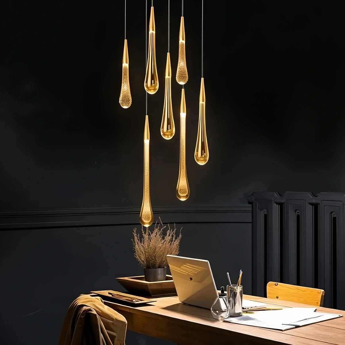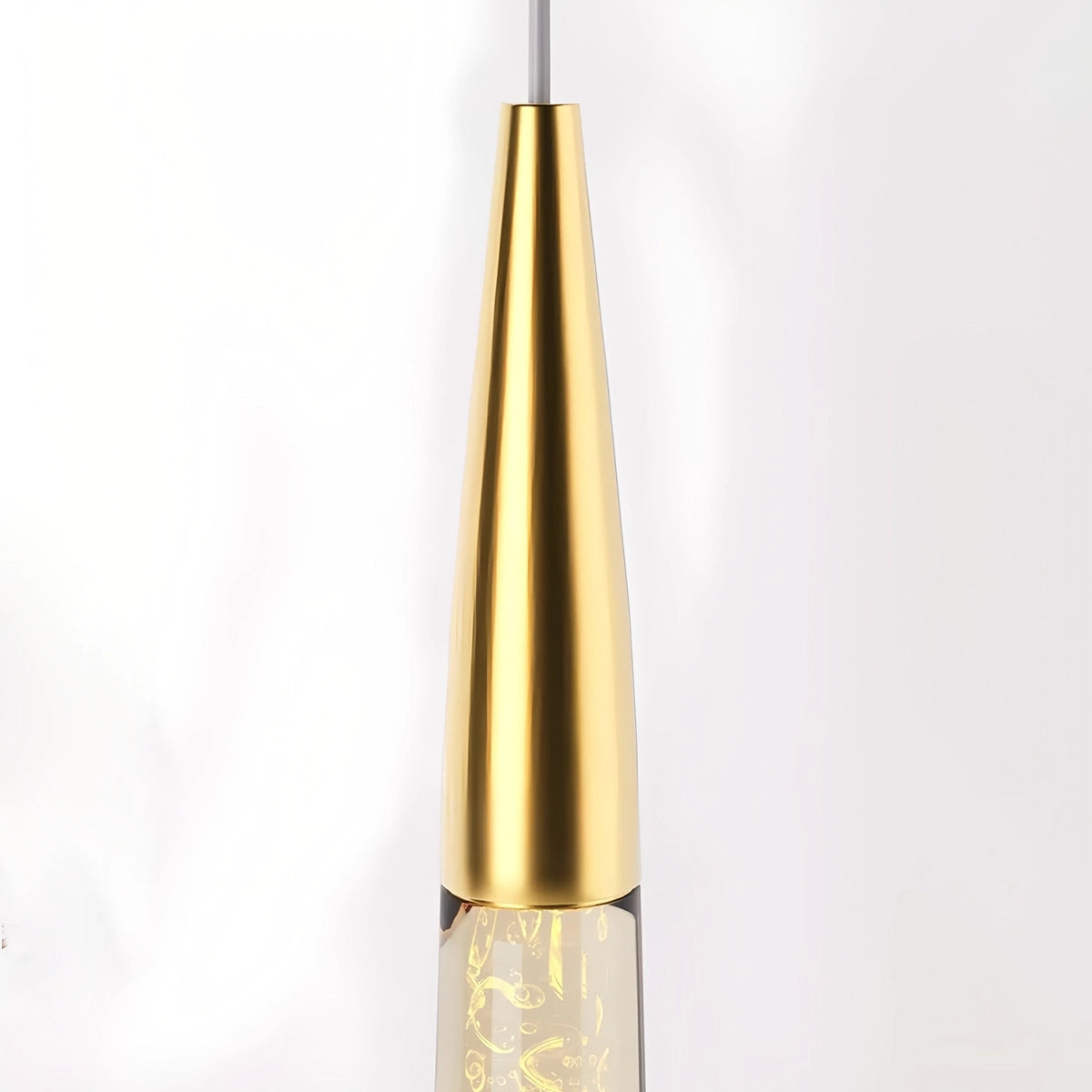 A mesmerizing union of modern artistry and timeless luxury, this pendant light captures the fleeting beauty of a golden droplet in motion. The interplay between its crystal core and lustrous gold-plated exterior creates a dynamic luminescence that transforms any space into a gallery of light.