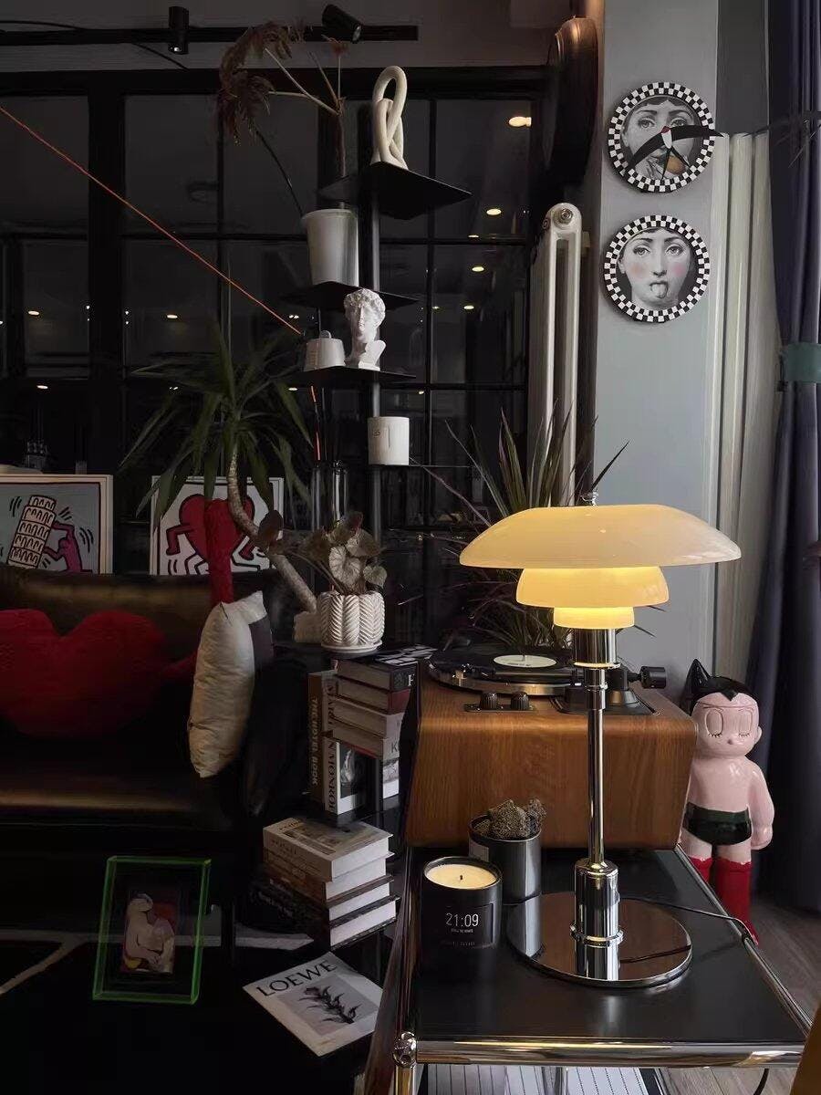 - Amber Glass Shade: Emits a warm, ambient glow.