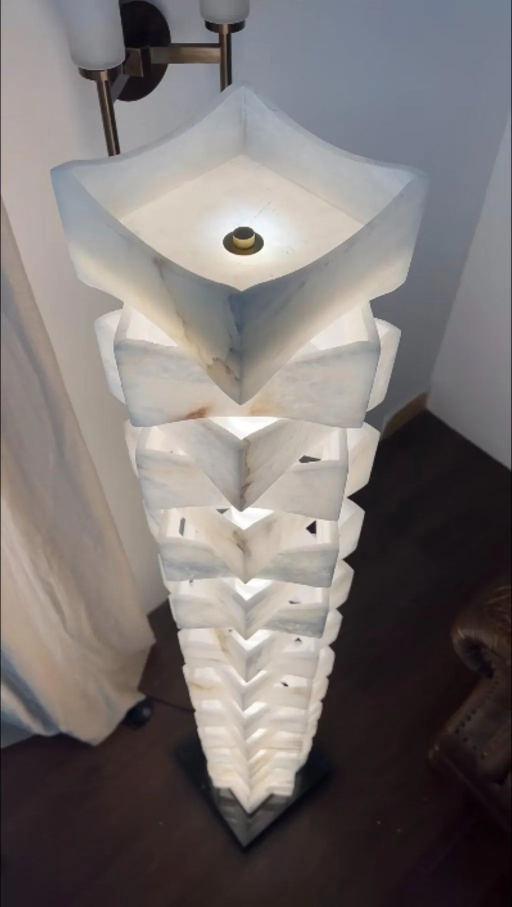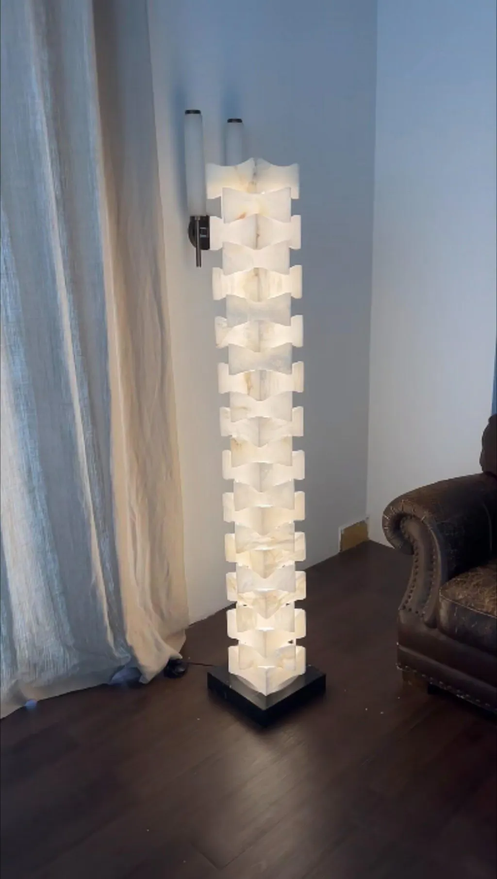 A sculptural lighting masterpiece that merges architectural geometry with organic stone beauty. The precisely stacked alabaster squares create a dramatic visual effect, casting a warm, ambient glow through the natural onyx's translucent veins.