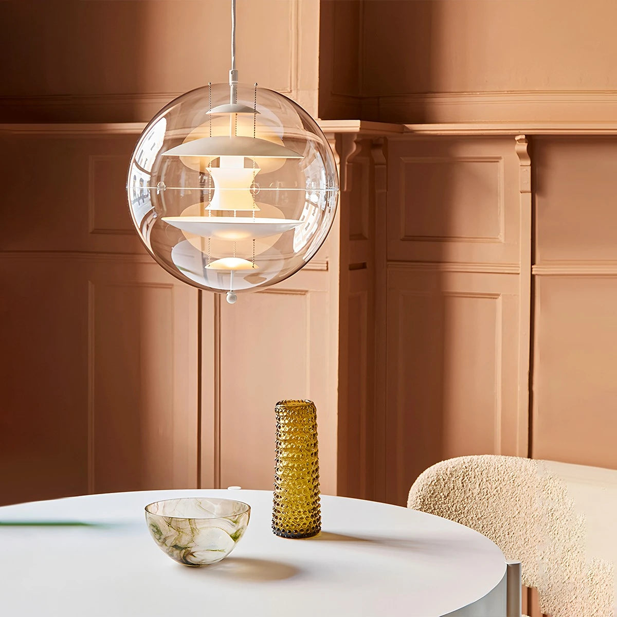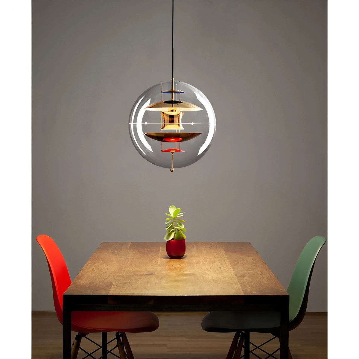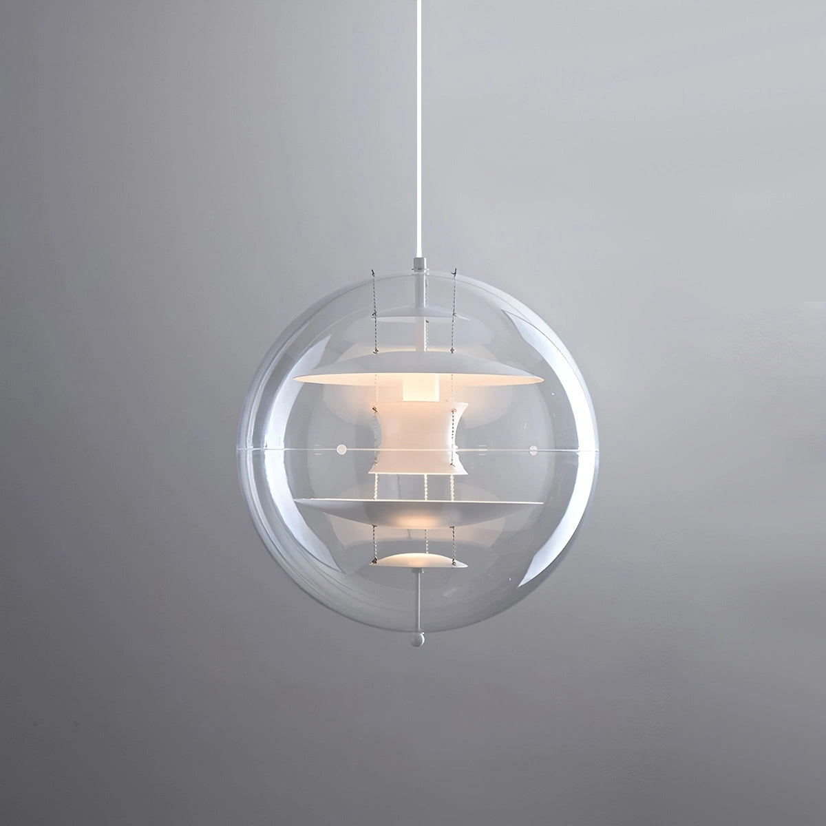 This modern pendant light features a clear glass globe paired with a sculptural layered metal interior, creating a refined balance of transparency and structure. Its soft ambient glow adds warmth while the elegant design makes it a subtle yet striking focal point in contemporary interiors.