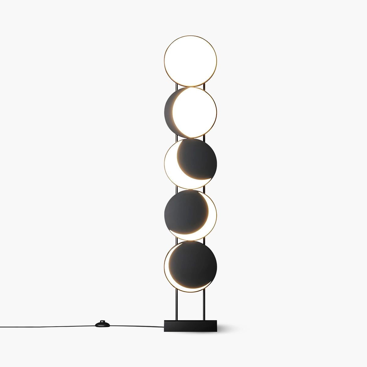 Inspired by the phases of the moon, this minimalist floor lamp features five glowing acrylic discs on a sleek iron frame. Its sculptural design adds soft, ambient light and a touch of modern elegance—ideal for living rooms, bedrooms, or contemporary spaces.