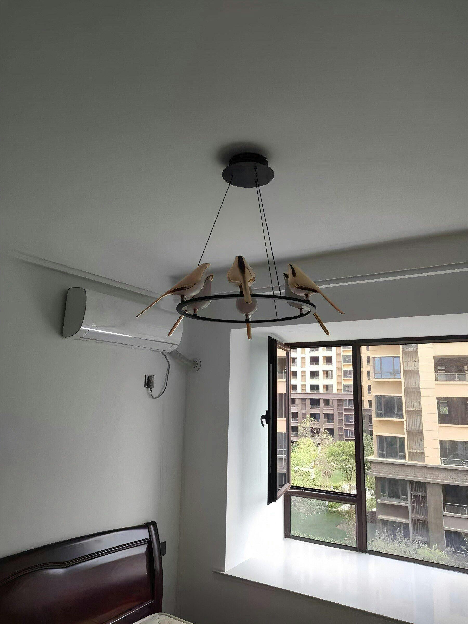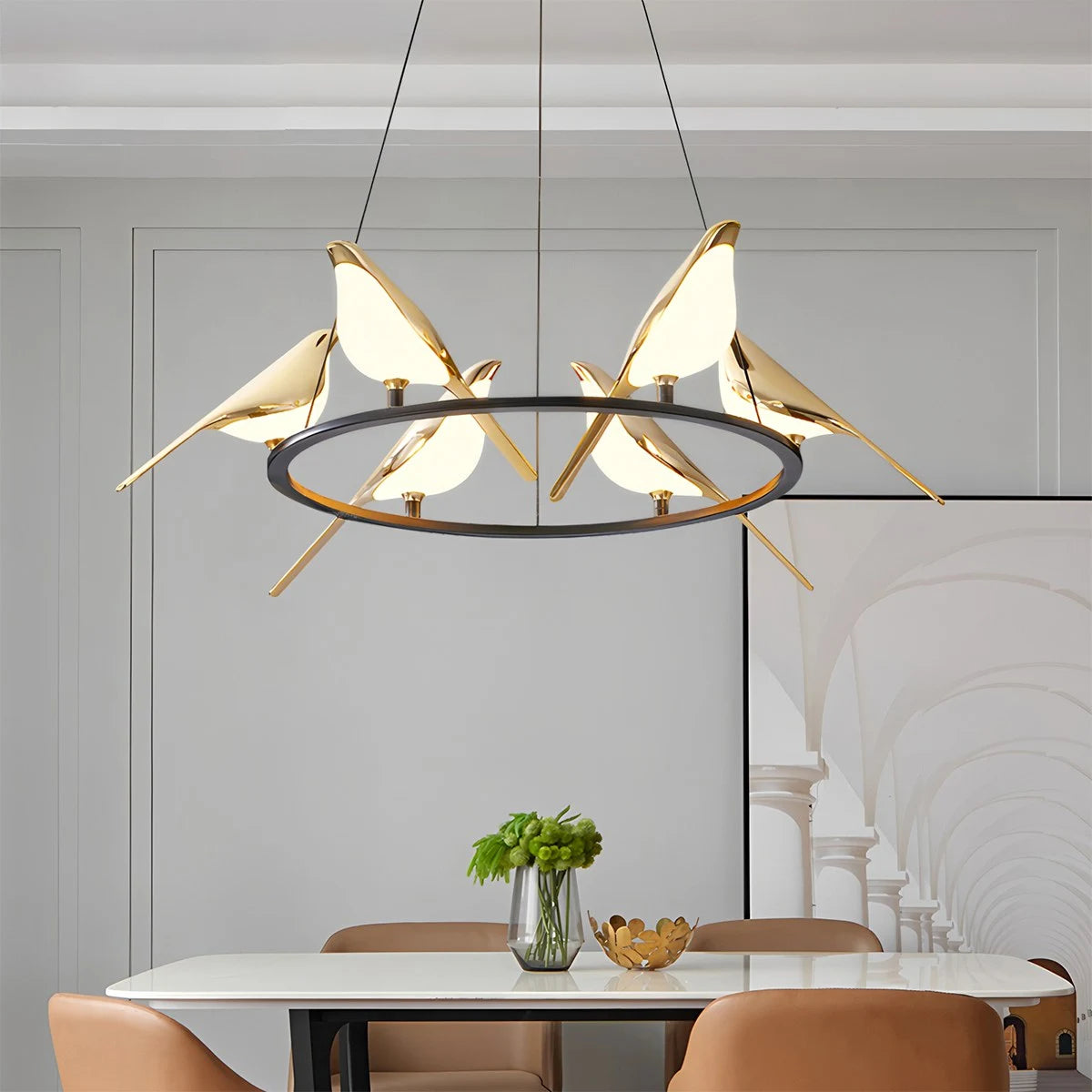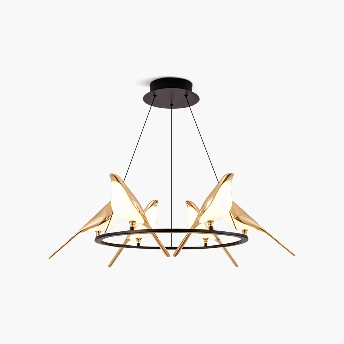 The Antizer Modern Gold Birds LED Chandelier features sculptural bird-shaped lights perched on a sleek circular frame. Finished in luxurious gold with integrated LED illumination, it brings elegance and playful sophistication to dining rooms, living areas, or entryways.