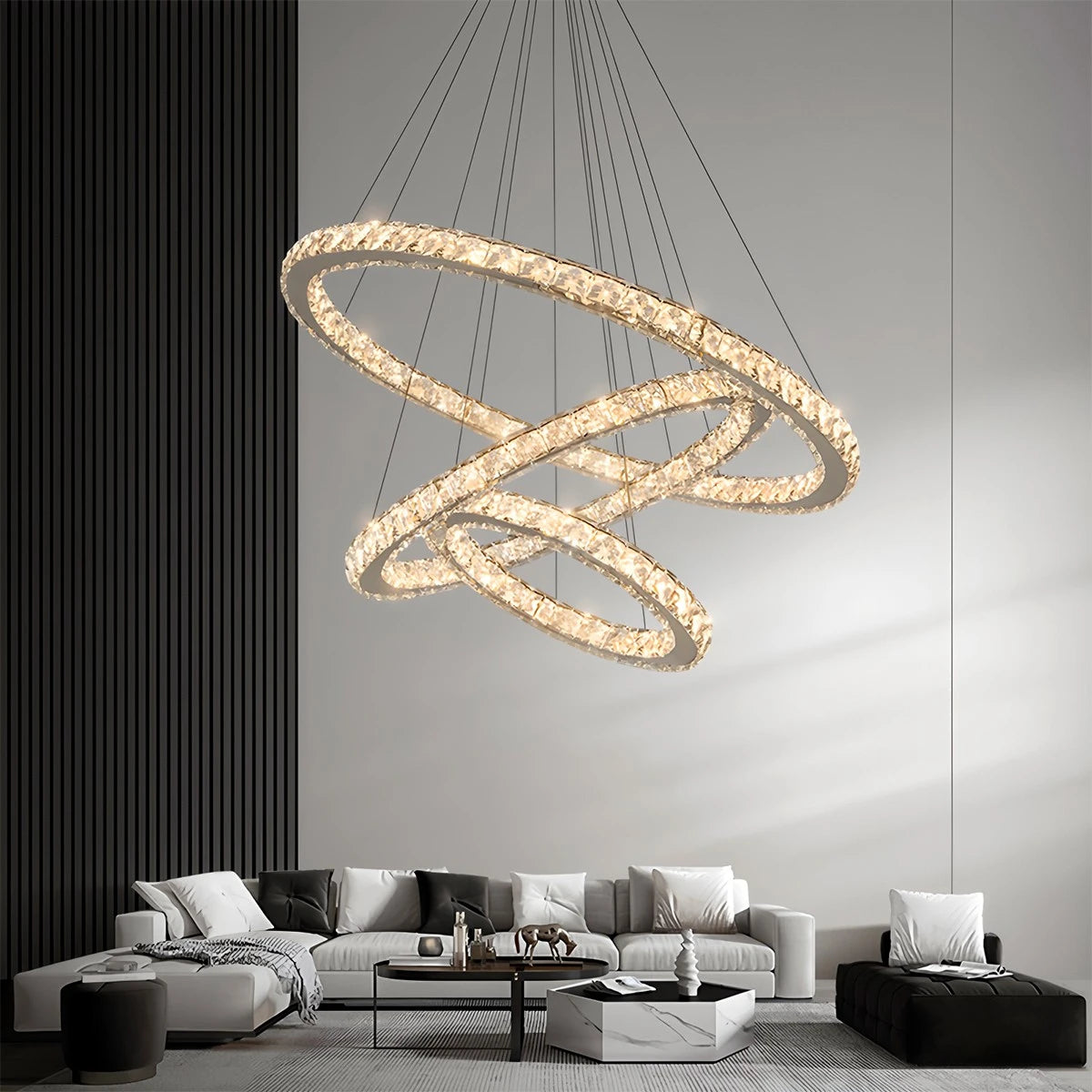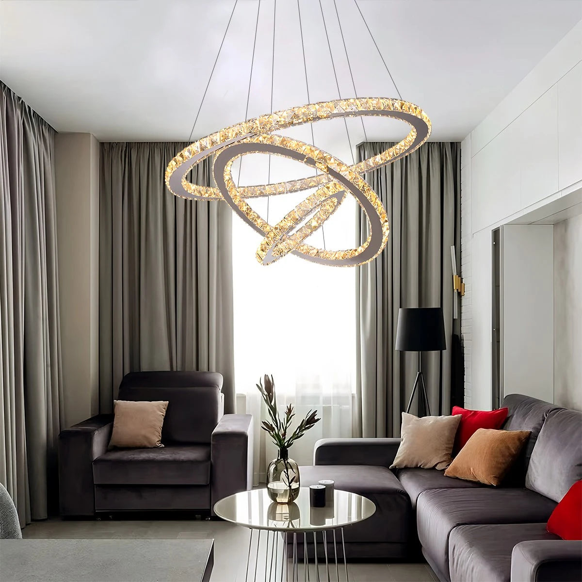 The Antizer Modern Light Luxury Circular LED Crystal Chandelier boasts an elegant design featuring multiple interwoven rings, crafted from high-quality metal and adorned with crystal details. This captivating chandelier casts a soft, warm glow, creating a sophisticated atmosphere in any modern interior. Its luxurious aesthetic makes it a perfect addition to living rooms, dining rooms, or entryways with high ceilings.