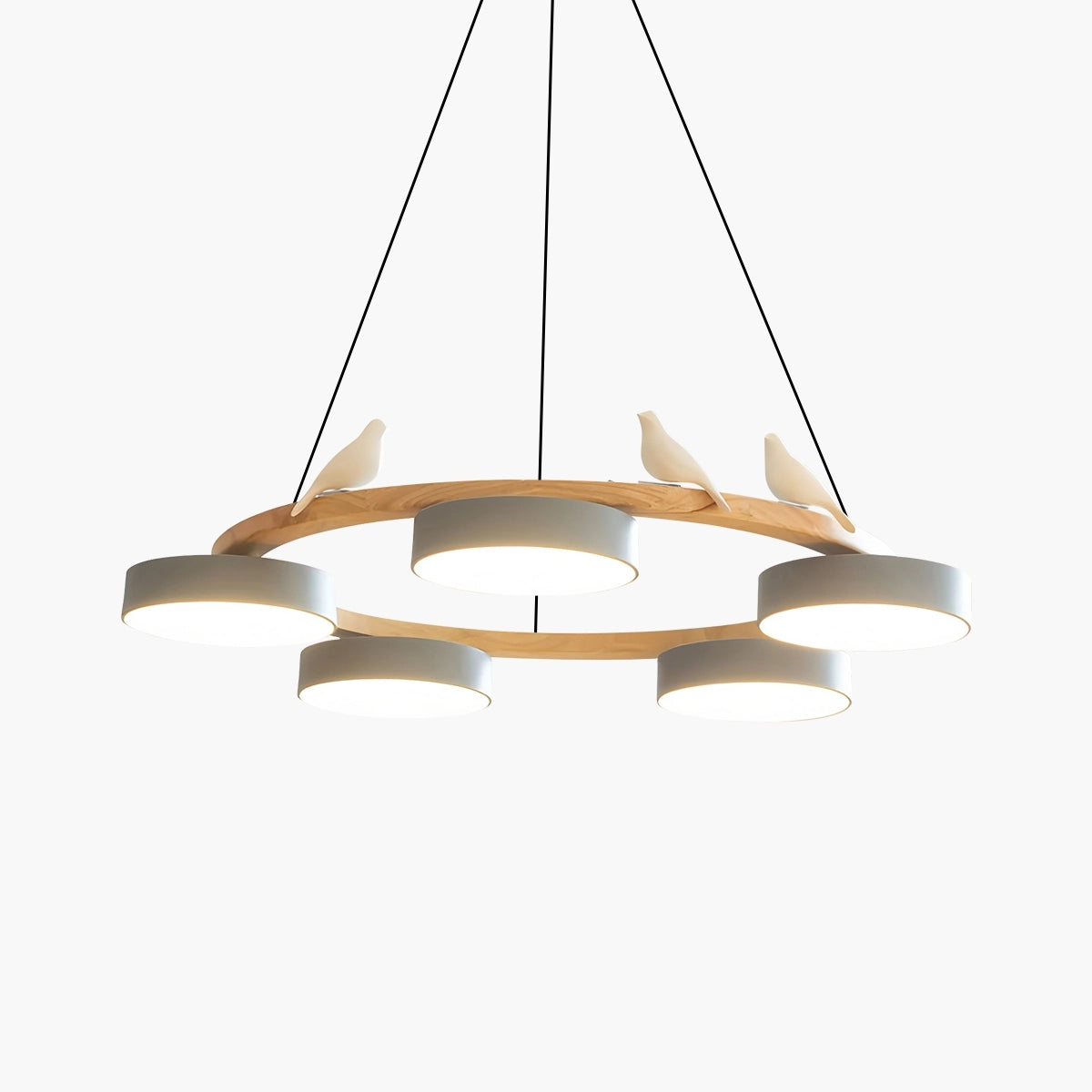 Transform your living space with the Dekorfine Sienna Bird Chandelier. This unique fixture blends modern design with nature-inspired charm, featuring a round wooden frame adorned with four lights and delicate bird figurines. It creates a serene, inviting atmosphere perfect for dining rooms, living spaces, bedrooms, or covered patios. The adjustable wire and sloped ceiling compatibility ensure versatile installation.