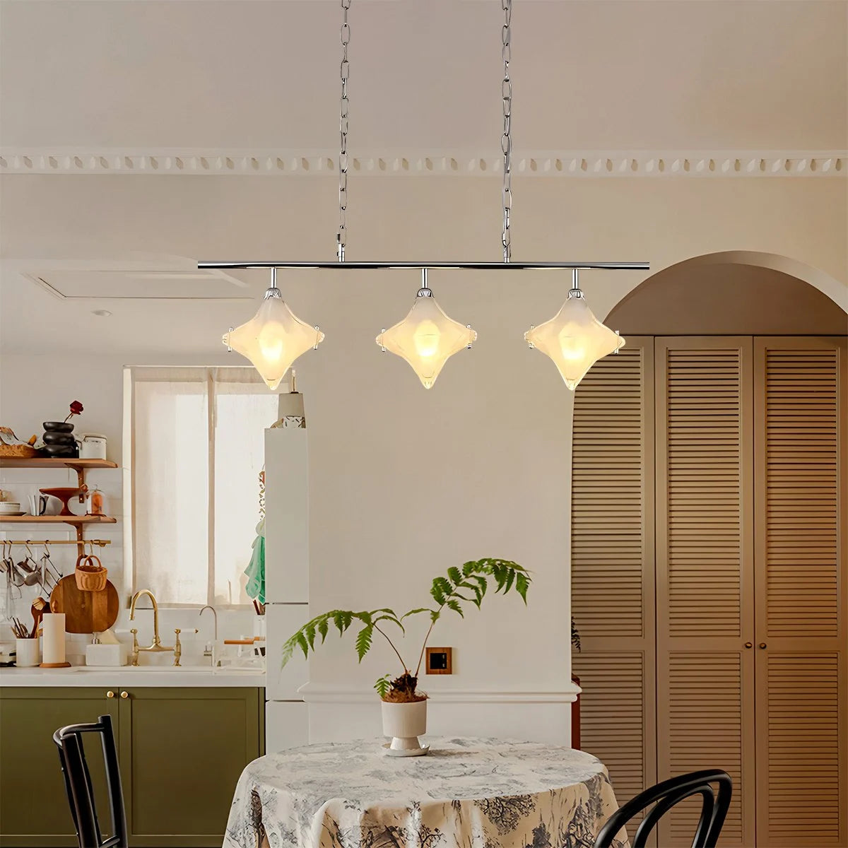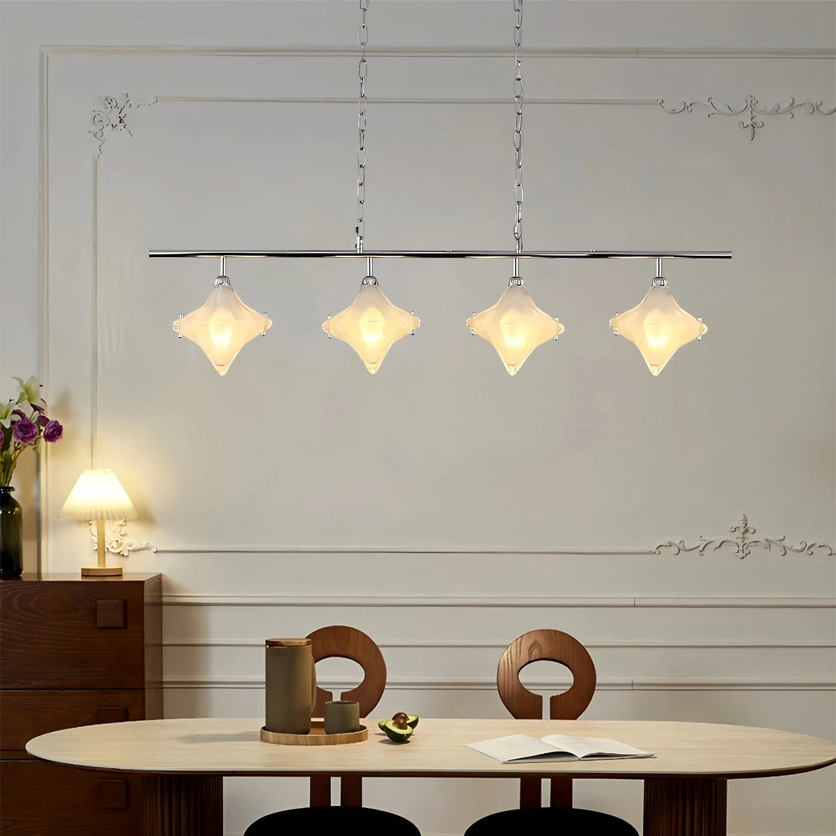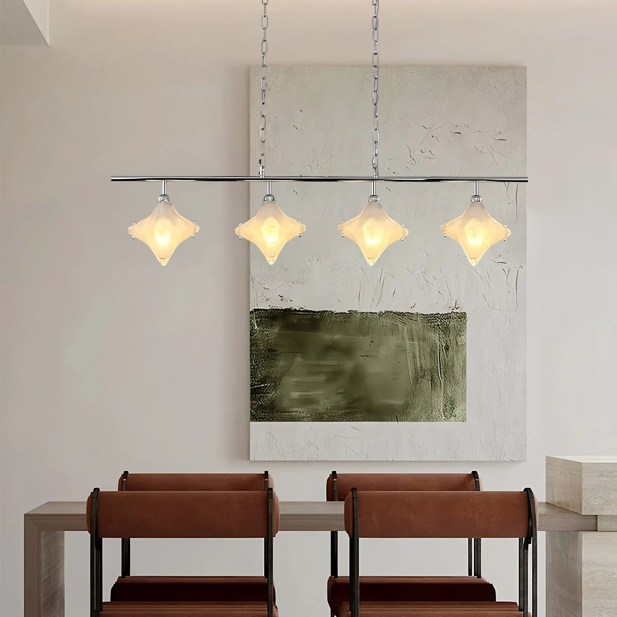Inspired by the night sky, the Antizer Sylume Star-Shaped Chandelier combines a sleek luxury frame with a hand-crafted star glass shade. Its soft, glowing light creates a warm, inviting ambiance while acting as a striking decorative centerpiece. Perfect for living rooms, bedrooms, and dining areas.